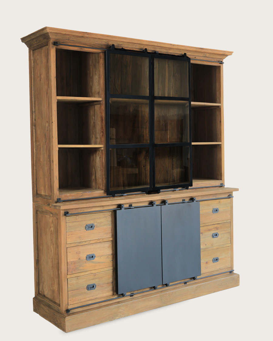 La bibliothèque Industryal grand format est un meuble très pratique pour un salon spacieux ou une grande salle à manger. Haute de 230 mètres et large de 1,80 mètre, elle est dotée de six niches et trois étagères dans sa partie haute ainsi que six tiroirs et deux étagères avec portes sur sa partie basse. C’est un meuble qui permet d’offrir une très grande capacité de rangement ! Idéal pour entreposer du linge de table, de la vaisselle, des livres ou du matériel de bureau, ce meuble vous permettra de garder votre pièce ordonnée et très bien organisée en toutes circonstances.