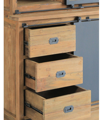 La grande bibliothèque Industryal est fabriquée en bois de teck massif. Cette essence de bois exotique est reconnue pour sa très haute qualité : résistante aux variations de températures, solide et durable, elle permet de fabriquer des meubles dotés d’une grande longévité. Les finitions de la bibliothèque Industryal sont, quant à elles, forgées dans du métal noir. Très esthétique mais aussi extrêmement tendance, l’alliance du bois de teck massif et du métal noir apportera beaucoup de caractère à votre salon, salle à manger, séjour, bureau ou bibliothèque.