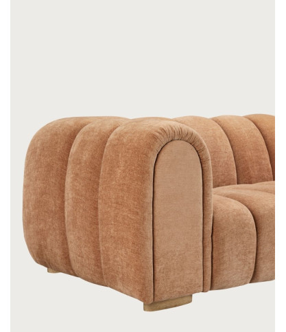 Mit einer Länge von 225 cm besticht das Sofa durch eine niedrige Rückenlehne, breite Armlehnen und gesteppte Kissen, die dem Ensemble eine elegante Struktur verleihen. Der Boucléstoff sorgt für eine besonders gemütliche Haptik – ideal für moderne, skandinavische oder retro-schicke Interieurs. Der leuchtende Terrakotta-Ton bringt Charakter, lässt sich aber dennoch leicht kombinieren.