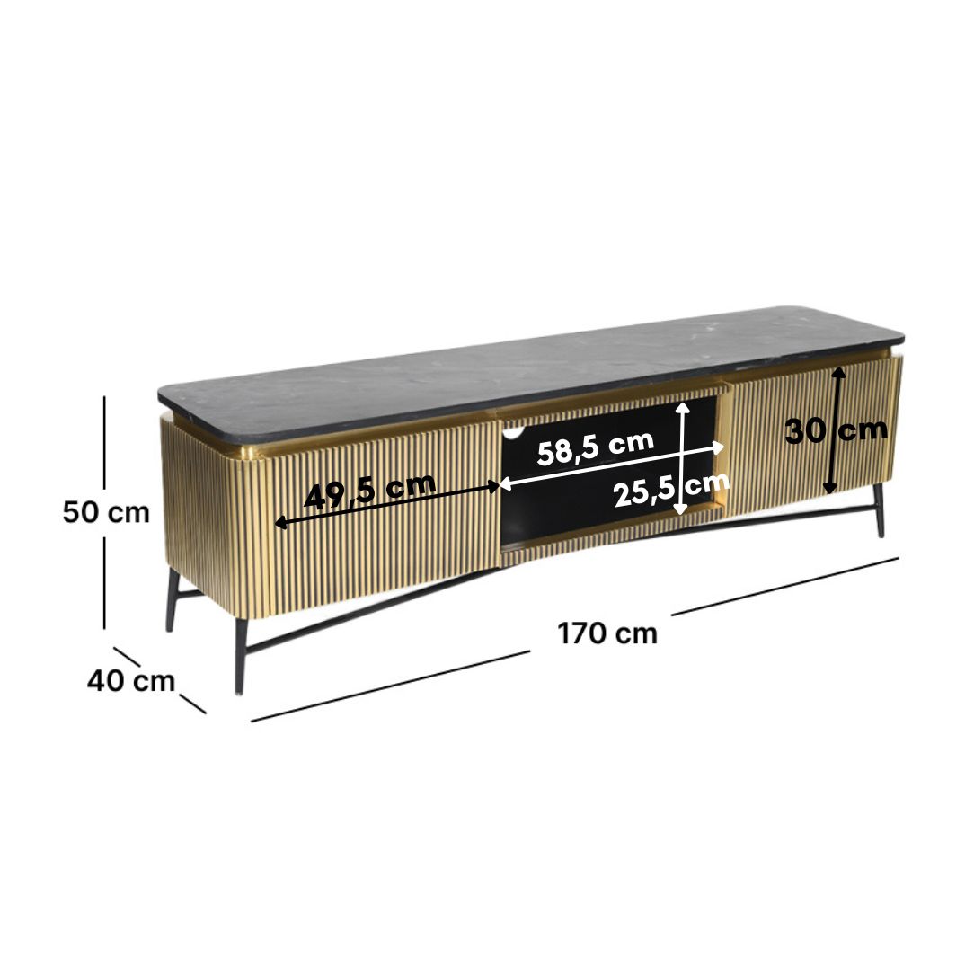 The Glory TV stand in golden brass is a stunning statement piece in your home, combining elegance and functionality. Its sophisticated design combines the elegance of black marble, the warmth of golden brass, and the robustness of solid mango wood, creating a perfect balance between modernity and refinement.