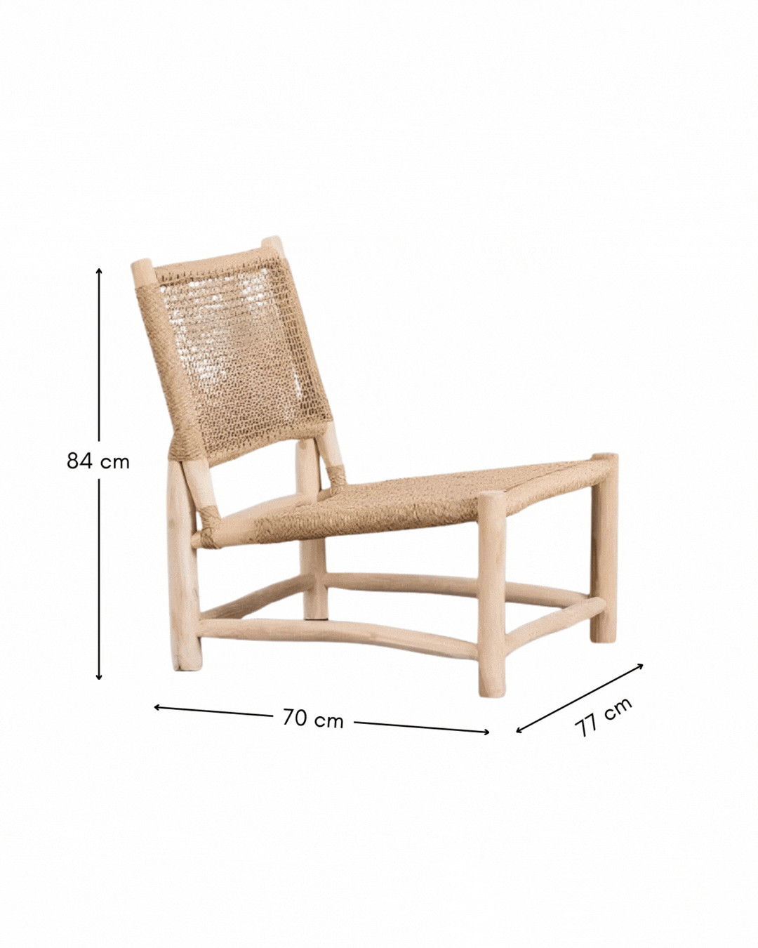 La structure en bois de teck apporte robustesse et authenticité, tandis que l’assise et le dossier en corde tressée offrent une esthétique légère et artisanale. Cette combinaison de matières naturelles donne à l’ensemble Jaya un style à la fois contemporain et chaleureux.