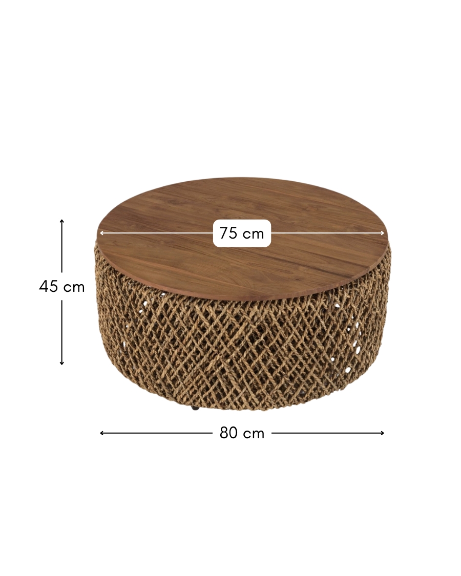 Son plateau rond en teck massif met en valeur les nuances naturelles du bois et offre une surface solide et élégante pour accueillir vos objets du quotidien. La base cylindrique, habillée d’un tressage artisanal en fibre de bananier, apporte du relief et un charme authentique qui évoque les intérieurs inspirés par les matières naturelles et les savoir-faire traditionnels.